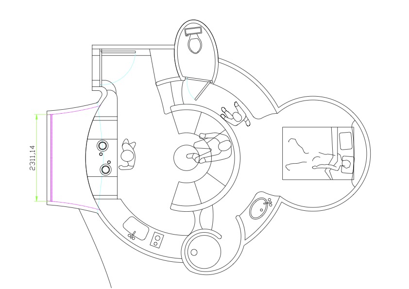 dessin maison bulle studio, plan 2 D, entrée, coin repas avec baie vue extérieure, cuisine et salon, puis quelques marches, wc séparé, mezzanine, dressing, chambre ronde, lavabo et douche